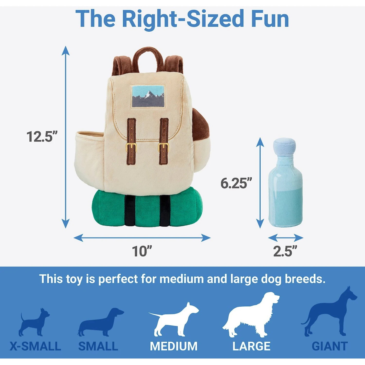 Bring the excitement of the great outdoors to your dog’s greatest games with this plushy backpack. Whether you’re camping out or glamping on the couch, get ready to unpack the fun with this two-toys-in-one combo! It comes with a removable plush water bottle that has a real, crinkly water bottle inside. Made with super soft, cuddly Velboa plush, this is one camping essential that’s always up for camping out or chilling in.