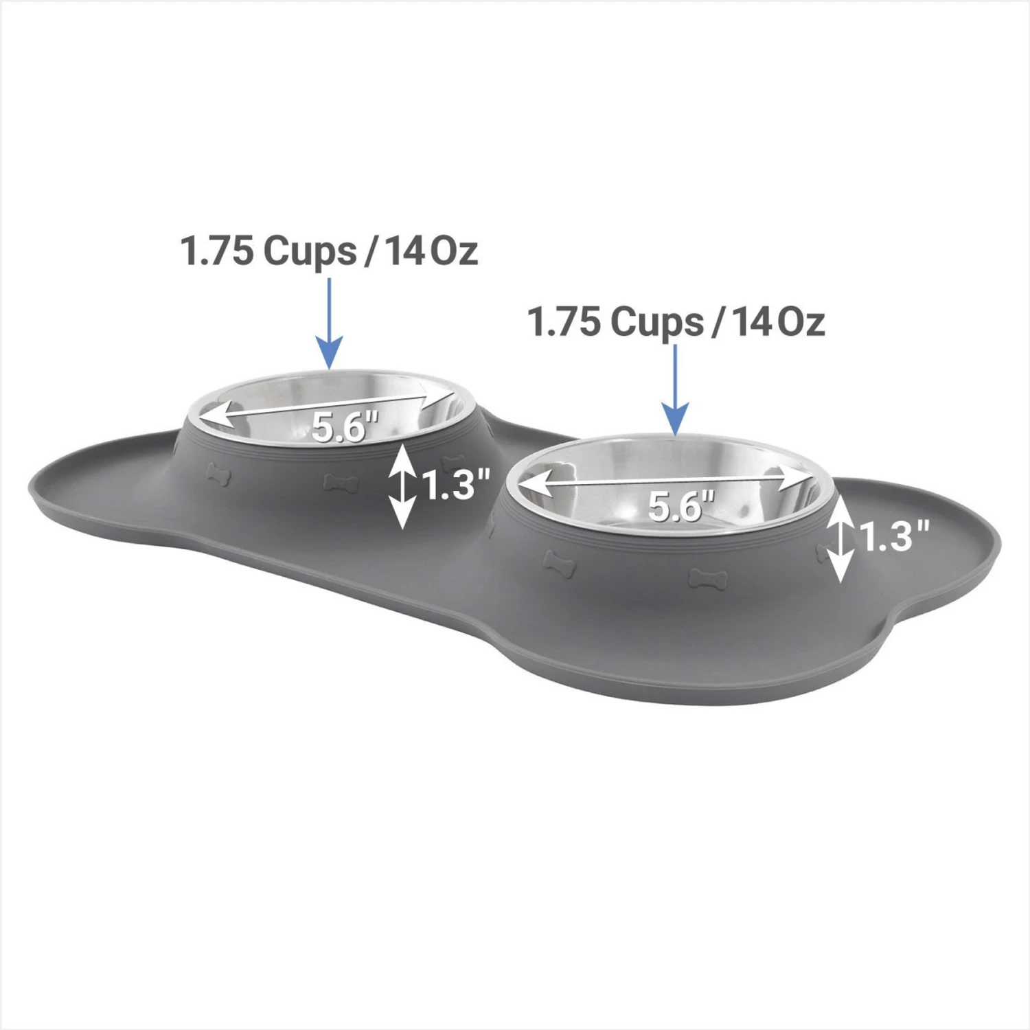 Frisco Double Stainless Steel Pet Bowl with Silicone Mat, Large, Gray, 1.75 Cups — Tip your hat to the virtually untippable Frisco’s Double Stainless Steel Pet Bowl with Silicone Mat. Designed to help prevent tipping over, these two removable stainless-steel bowls fit firmly into secure slots inside the silicone mat, which helps prevent spills too.