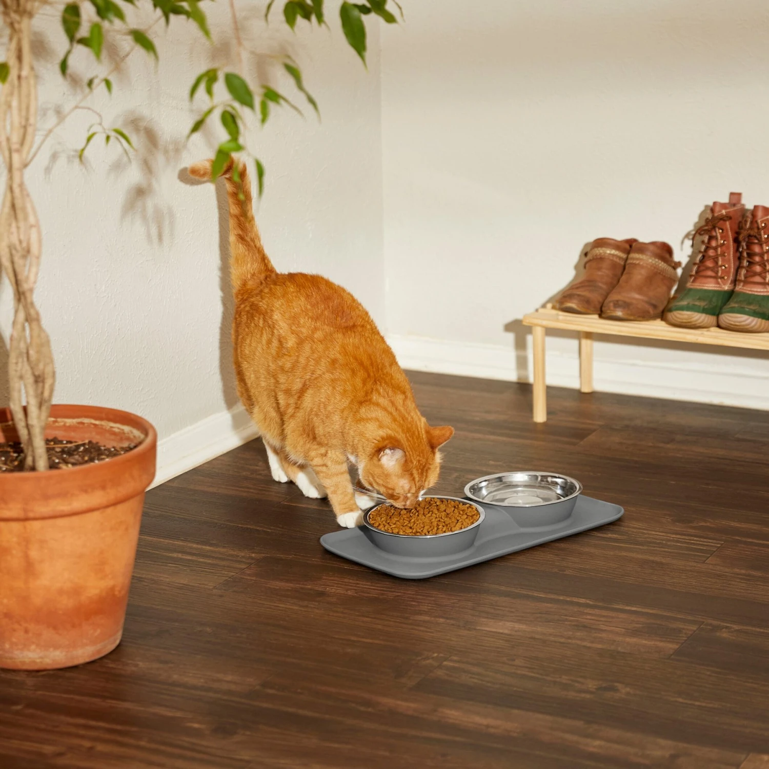 Dinner is serious business for heavy duty pets. Serve their meals in a heavy duty diner to match! The tough, silicone base features a rim that helps contain food and water messes, keeping your floors clean and all their grub where it belongs: in one convenient and easy-to-clean spot. This diner also includes two durable, stainless steel, dishwasher safe bowls.