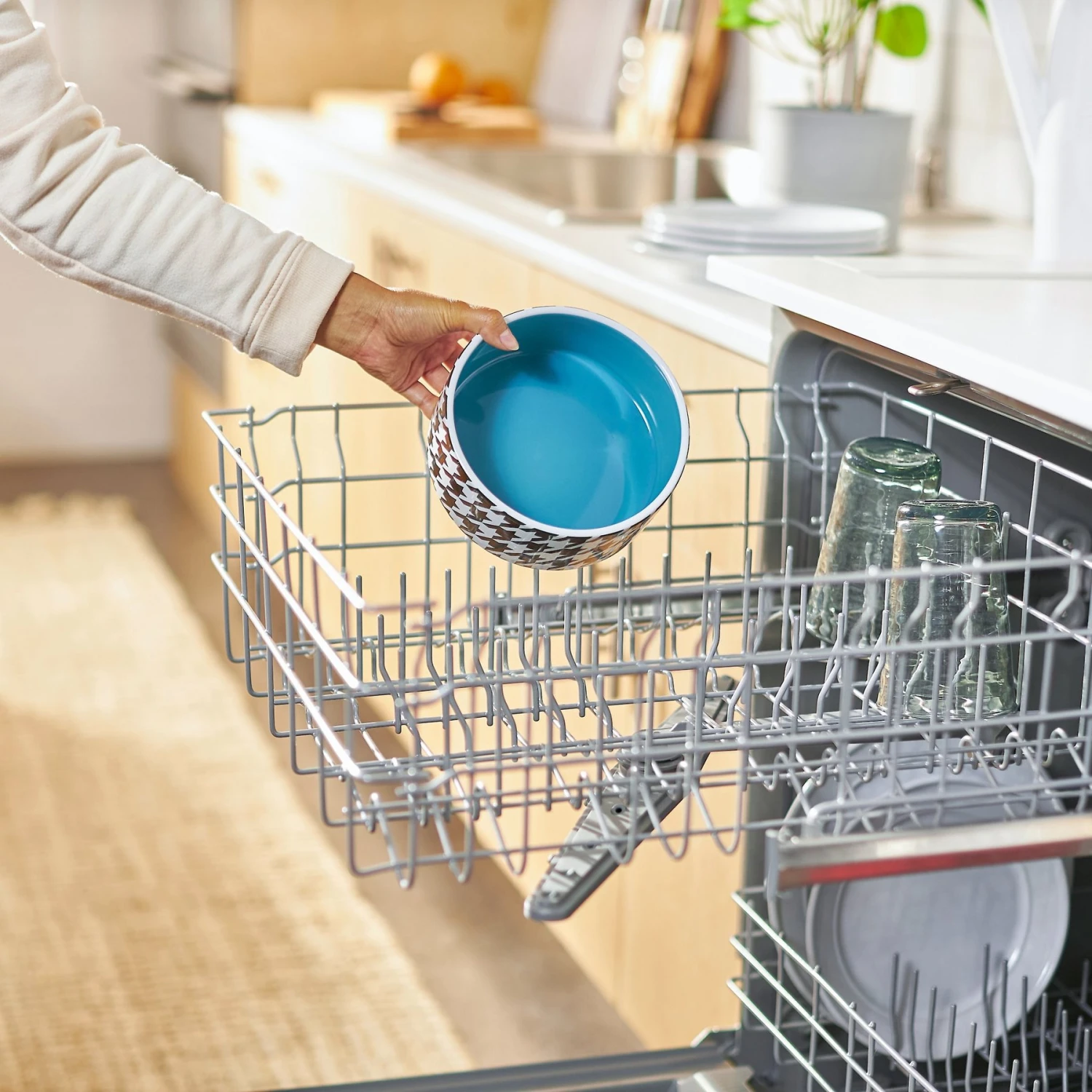 Elevate your doggie dinnerware with the Frisco Houndstooth Non-Skid Ceramic Dog Bowl! This bowl features a classic, black-and-white houndstooth pattern on the outside and a blue glaze inside, so it really pops in your home. Have an excited eater who tends to make a bit of a mess at mealtime? No problem! This bowl has a non-skid bottom to help hold the bowl in place to cut down on tips and spills. Plus, it’s available in two sizes, so you can find the best bowl to fit your pet’s appetite.