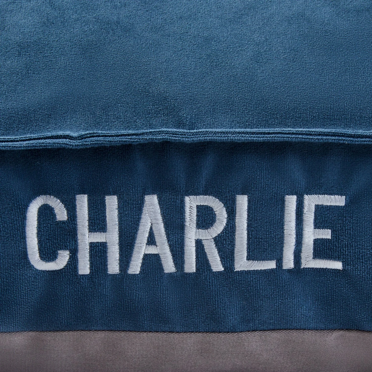 Make naptime personal for your dog with the Frisco Personalized Navy Bolstered Bed! This single-side, back bolster-style bed features a soft, microfiber cover, a supportive bolster with a navy-checkered pattern and lots of lofted polyfill inside. It’s customizable with up to 10 embroidered characters in your choice of white or light gray thread, and flair script or block caps font. It literally has your pet’s name on it! Plus, there’s no need to worry if it gets a little dirty—just unzip the YKK zipper and give the machine washable cover a spin to keep it clean, comfortable and inviting, nap after nap.