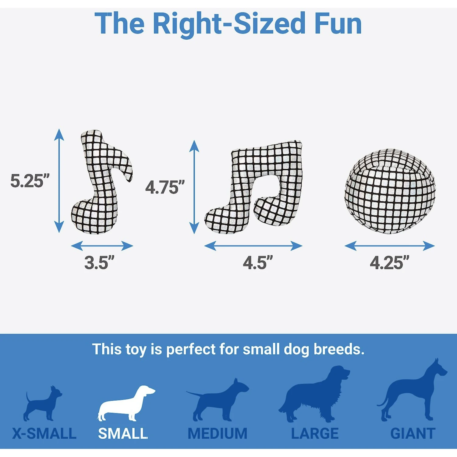 - Comes in a three-pack with a disco ball and two musical notes for your dog to groove to.