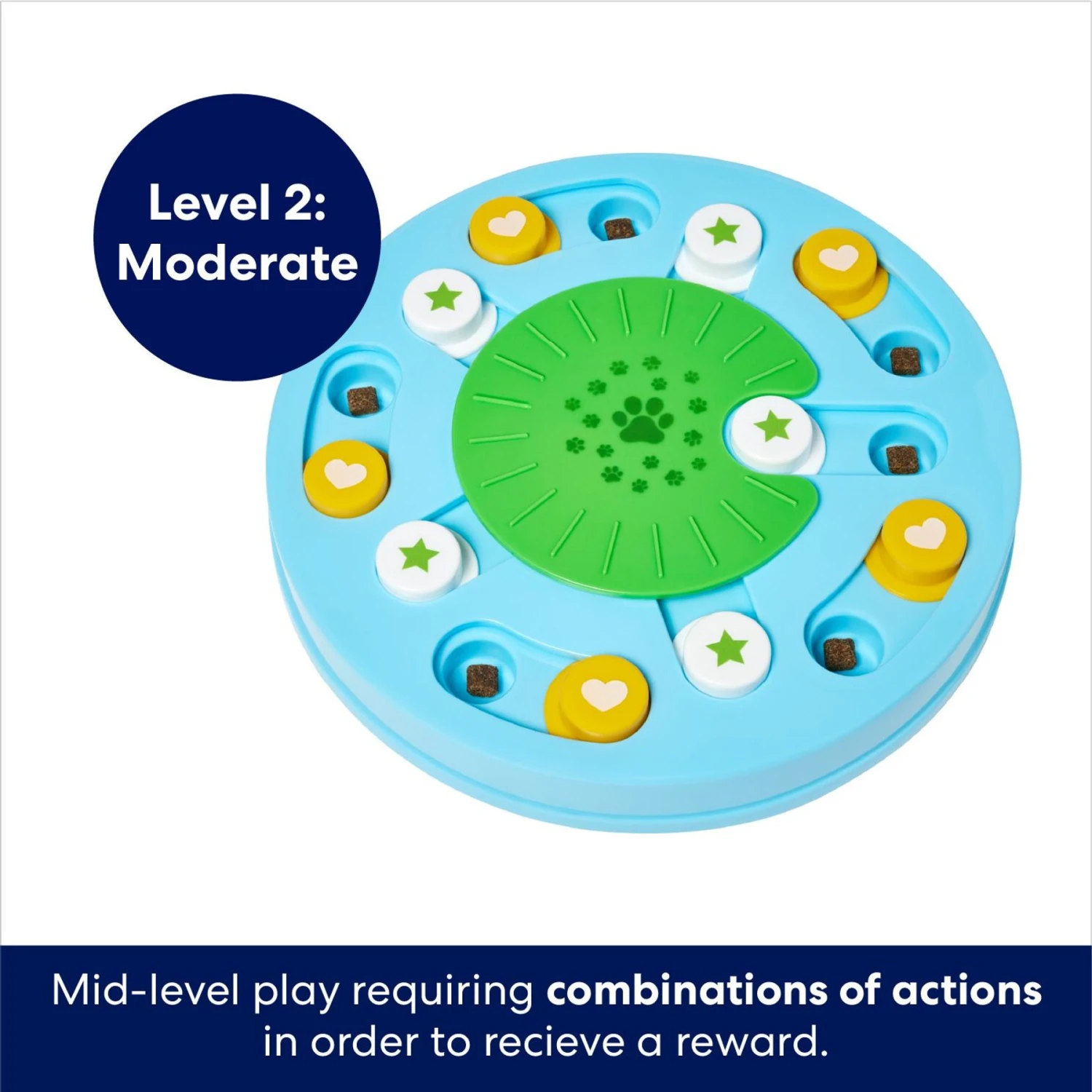 This moderate level pup-puzzle from Frisco by Chewy brings a captivating activity to the dog detective who already has a little experience solving interactive games, but who’s ready to bite into a bigger challenge. Small treats or kibble can be placed in the nooks and hidden underneath the sliding pieces, offering up a more moderately difficult level of play that’s sure to stimulate your pup’s brain, fight off boredom and provide a fun, interactive opportunity to bond.