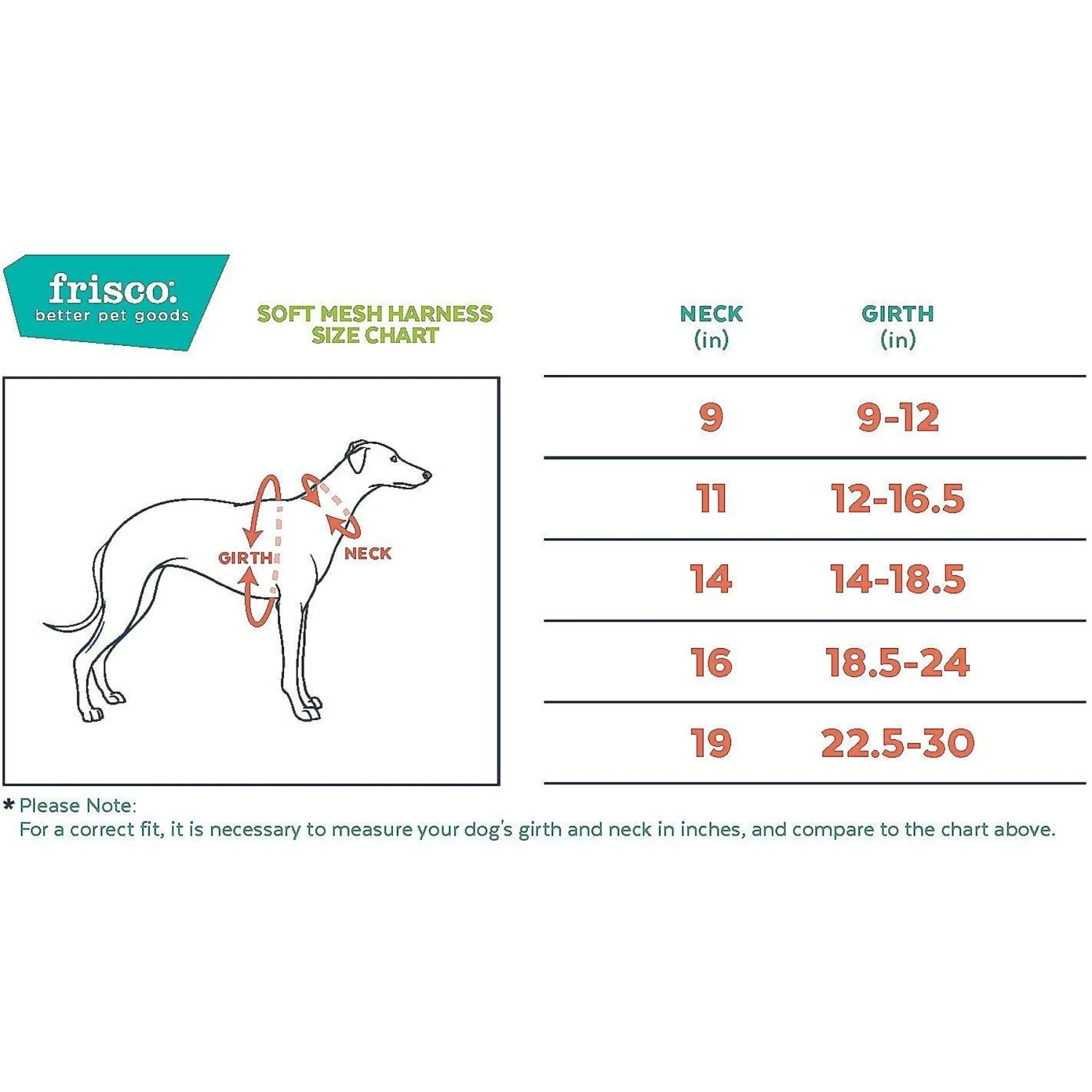 Please supervise your dog while harness is being worn. Each style of Frisco harness is designed specifically to fit certain sizes. For the correct fit, please make sure to measure your dog’s girth in inches and compare to our size chart.