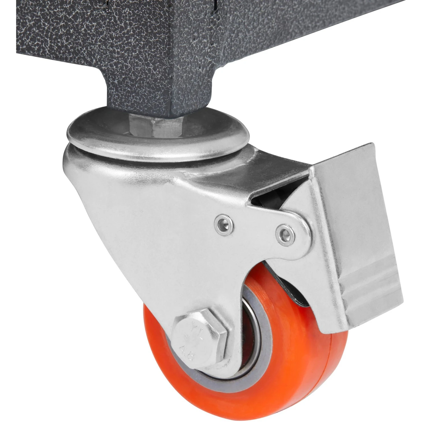 4 wheels, 3 connection tube bars (for stacking), 4 short screws, 8 long screws, 1 allen wrench