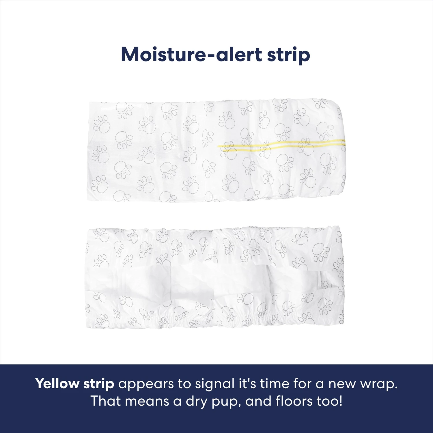 Frisco Disposable Male Dog Wraps, X-Large, 12 count—Wrap your pup up in a dependable bundle of comfort with these disposable dog wraps from Frisco by Chewy. The moisture-lock technology turns liquids into a solid gel for the ultimate in leak protection, and the moisture-alert strip lets you know the moment they need a change. The wraps are designed specifically for male dogs and are available in an array of sizes so pup parents everywhere can feel wrap-happy.